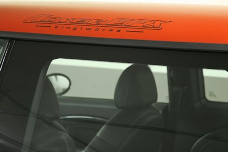 On the exterior, the Cooper S R53 features a flat grey vinyl wrap for the body contrasted by the orange colored roof, front fenders and 17-inch multi-spoke alloy wheels in black with an orange rim.